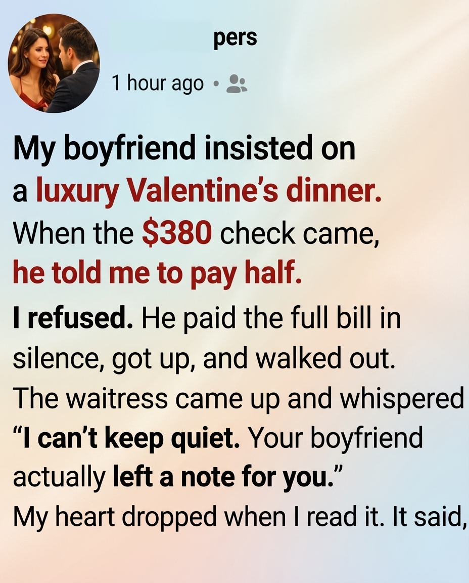 The mood shifted slightly, though there was no argument or raised voices. He quietly paid the bill in full, stood up, and left the table. I remained there for a moment, wondering if I had reacted too strongly or if I had simply been honest about how I felt. As I started gathering my belongings, the waitress approached and handed me a small folded note, explaining that he had asked her to give it to me before he left.